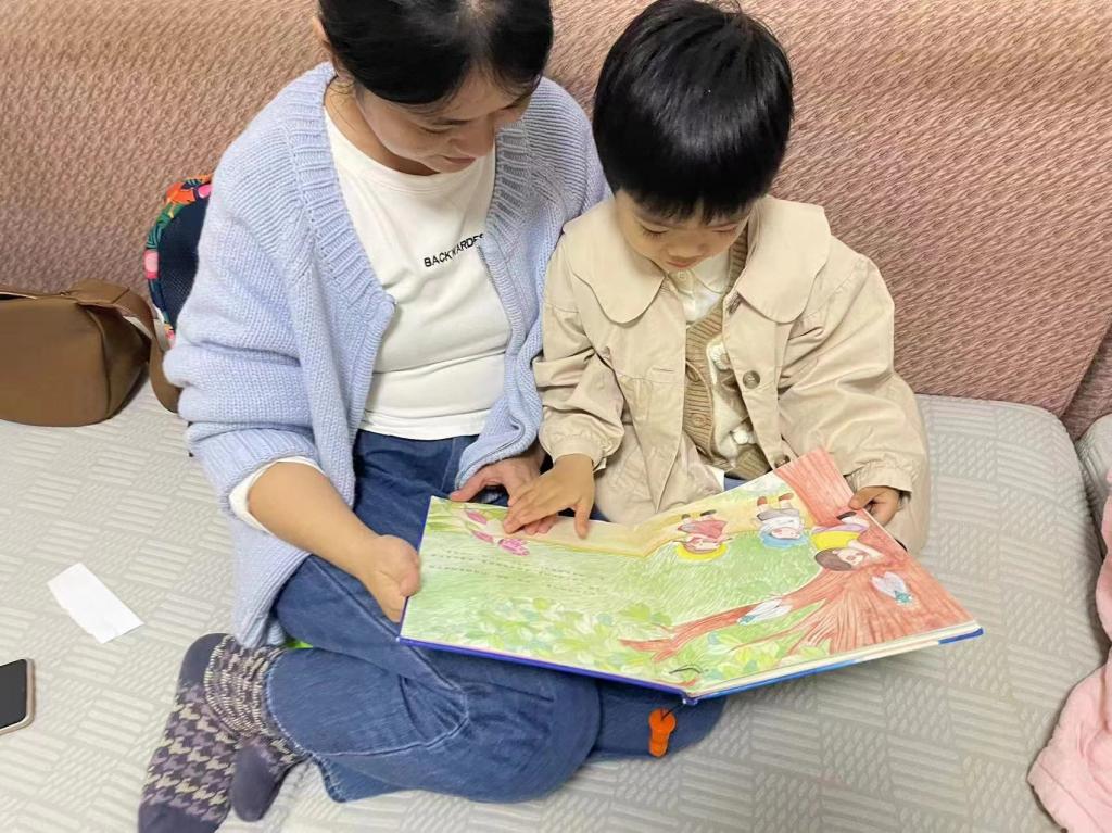 在温馨的亲子共读时光里,爸爸妈妈和小朋友们一起,你指我看,你读我听;你抱着我,我靠着你,互相依偎……在轻柔的读书声中,流淌着满足而平静的浓浓亲子情。