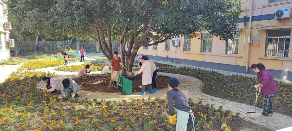 在大大的花园里面,挖呀挖呀挖,种小小的种子,开小小的花。为美化园内环境,11月7日,幼儿园全体教师在园内齐心协力除草种花。