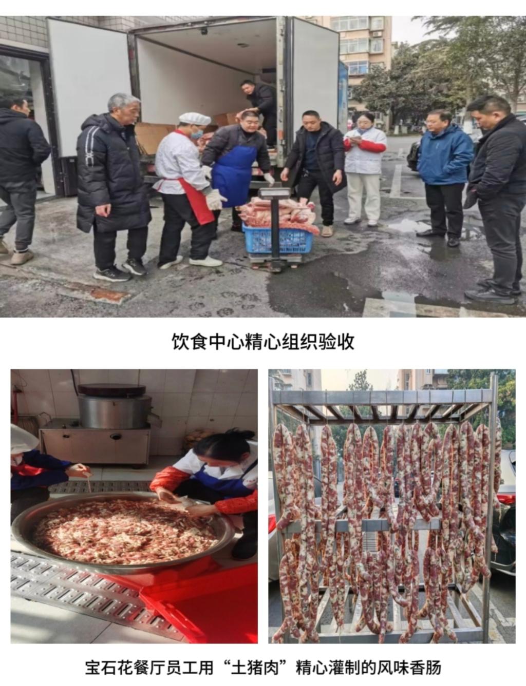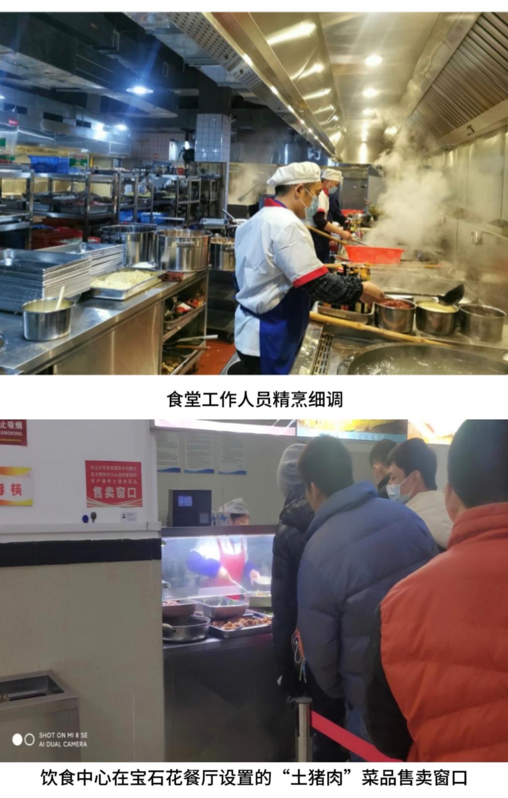 12月22日,一辆满载着兴山县水月寺镇郑家埫村——学校定点帮扶村“土猪肉”的箱式货车经过长途跋涉后驶抵东校区宝石花餐厅。经后勤饮食服务中心工作人员验票(货物相符)、验收(过磅称重)后,3033.8斤总价值约10万元定点帮扶村“土猪肉”按计划分发至荆州校区各食堂,由各食堂工作人员经过精心加工、精烹细调后,以粉蒸排骨、青椒炒肉片、莴笋炒肉丝、莲藕排骨汤等成品菜肴的形式端上师生餐桌,让广大师生足不出校就可以品尝到定点帮扶村村民采用传统土方法、不使用饲料和添加剂饲养的“土猪肉”,饮食中心以健康、营养食材烹制的菜品惠及师生。