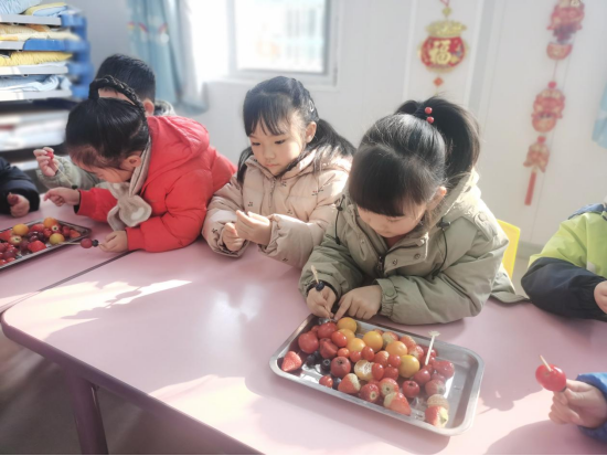 大班组以“做灯笼、做鞭炮”为主线,孩子们自己动手做灯笼、鞭炮、糖果,感受新年的气氛;中班组开展糖葫芦串新春活动,幼儿们跟老师一起动手制作水果糖葫芦,体验过节的快乐;小班组的孩子们聚在一起举办了热闹非凡的联欢活动,孩子们唱唱跳跳一起度过快乐的时光。