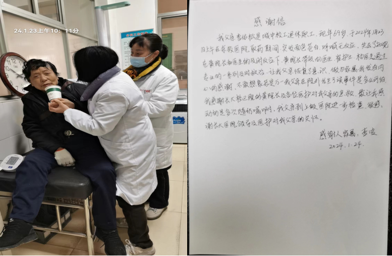 (通讯员 龚轩) 1月23日,城中校区退休职工李佑松老师到东校区医院开药,取药期间突然面色苍白,出现意识不清,呼之不应,正在值班的校医院副院长黄宗立刻与值班医生向昌娅一起,召集药房司药杨胡涛、护士崔恒星等人进行抢救。通过进行心肺复苏等救治,患者逐渐恢复意识,后来家属将其接回家。此后,校医院多次电话随访,关注李老师健康,建议其到大医院继续检查和治疗。患者家属非常感谢,24日上午专门给校医院送来感谢信。