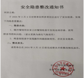 根据伟德体育3月3日安全工作会议精神,3月4日安全与质量管理办公室(以下简称安管办)分别对东、西校区社会化公寓进行了餐饮业燃气、用电设施专项督查。根据检查结果对河滨公寓下达了安全隐患整改通知书。