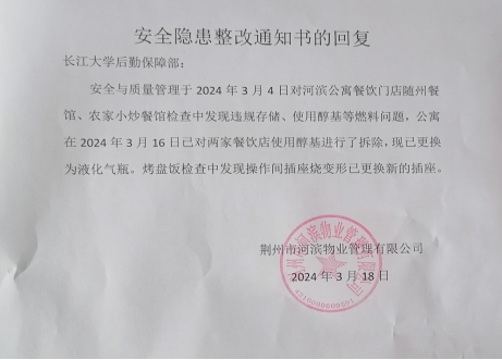 3月18日安管办收到河滨公寓安全隐患整改通知书回复。