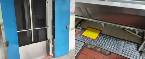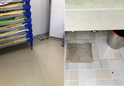 为了防止鼠类进入食堂,在食堂门口放置了挡鼠板和粘鼠板,形成了双重保障。