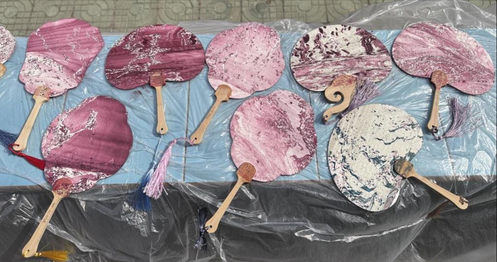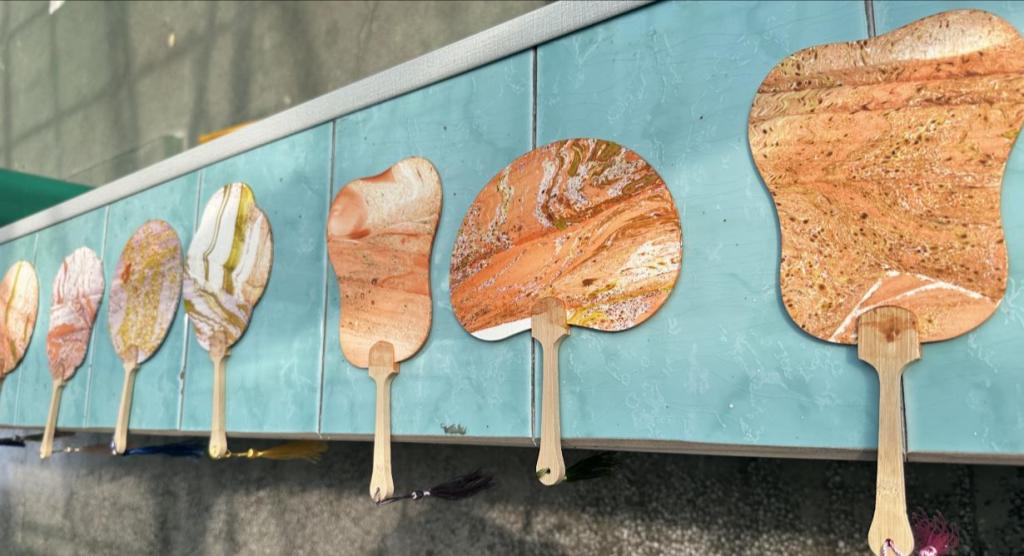 在制作过程中,大哥哥大姐姐们耐心指导,手把手教孩子们如何挑选漆料、运用色彩、绘制图案。孩子们则充分发挥自己的想象力,绘制出了各具特色的扇面作品。有的扇面色彩斑斓,有的则温柔浪漫,每个扇面都充满了孩子们的创意和想象力。
