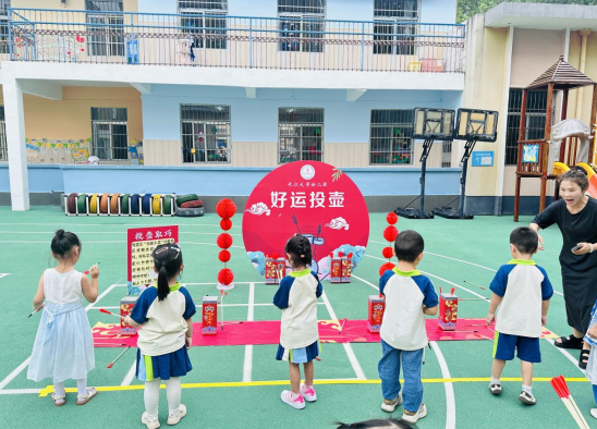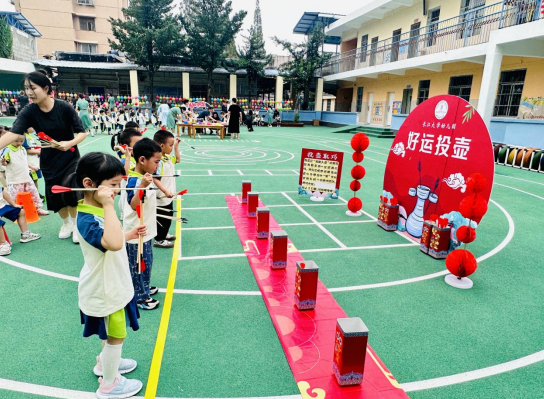 孩子们兴高采烈地排队参加“趣味投壶”,小勇士们手持木箭,大显身手,全神贯注地瞄准壶口,每一次精准的投入都引来周围小伙伴的阵阵欢呼。