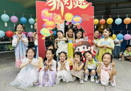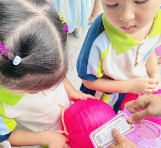 为了点缀节日气氛,园内各式花灯逐一挂起,好不热闹。每盏灯笼下藏着谜语,在老师的引导下,孩子们手提灯笼低头沉思,或与伙伴讨论,益智趣味的赏灯猜谜游戏,让这个中秋节更加难忘。