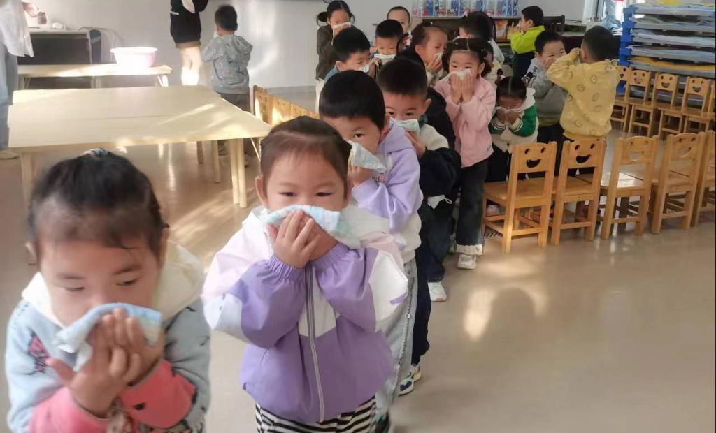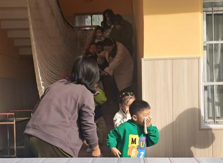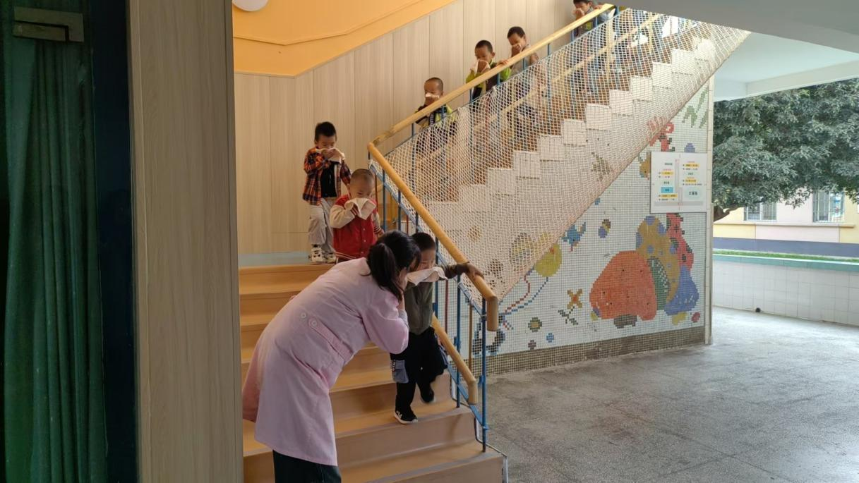 上午9时整,一阵急促的警报声响彻园所。幼儿园应急指挥部、楼道安全引导组、应急疏散组、医疗救护组人员迅速到达责任区。孩子们在各班教师的带领下,快速用湿毛巾捂住口鼻,弯腰伏身,紧张有序地按照预定疏散路线撤离到指定安全区域。