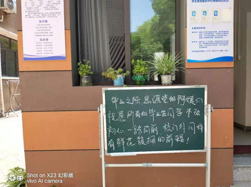 毕业总是伴随着离别和伤感,还有对未来的迷茫与彷徨。宿管阿姨们主动与毕业生谈心交流,尽量帮他们解决一些困难。还利用小黑板写一些温馨提示,和对毕业生的美好祝福,让同学们感受到关怀,用温情和热情的服务疏导、化解他们在离校时的焦虑情绪。