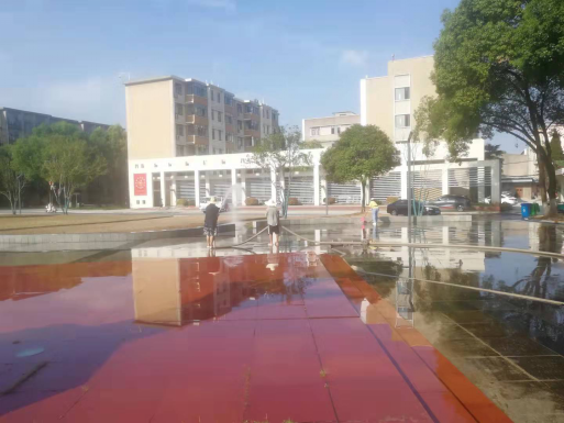 物业服务中心积极配合学校的“雨污分流”工程,全力以赴做好校园保洁工作。中心要求,清扫车进行全天候洒水作业以除尘降燥;环卫清扫人员定时冲洗以确保道路整洁,对重点场所加强清洗力度以保证清洗质量。
