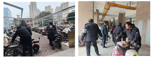 同时,在各入口摆放锥桶,拉上警戒线,限制车辆进入,并张贴了“禁止电动自行车驶入”的提示,提醒同学们安全停放车辆。对于现场不理解的学生,耐心进行解释和教育,向他们宣传电动车乱停乱放可能带来的安全隐患,引导学生积极支持并自觉规范停车。
