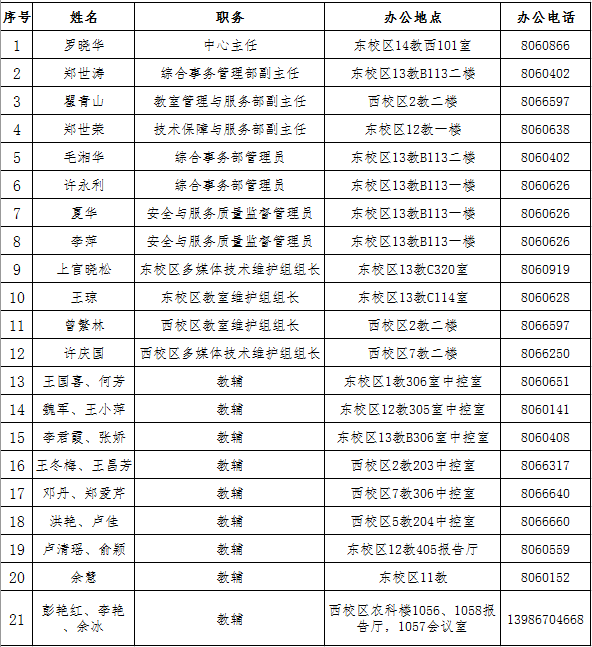 教室维护服务中心领导及各部门负责人联系电话