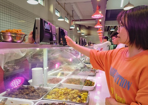 “滴……交易成功。”在学生三食堂内,中文(师范)11903班曹萌梦打开微信支付二维码,对准小碗菜窗口的一台卡机轻轻一扫后,食堂阿姨随即将一碗香喷喷的玉米排骨汤递到了她的手中。这种因无需充卡、找卡所带来便捷正是得益于学校学生食堂“校园一卡通”系统的更新。