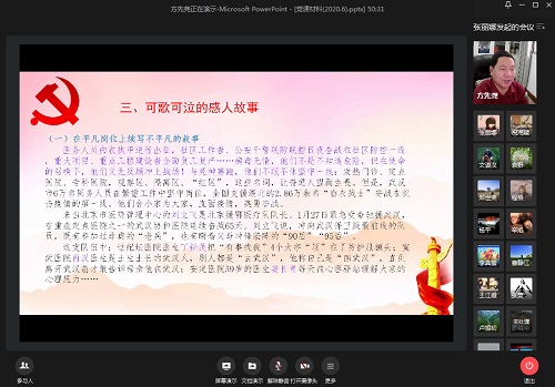 开展同上一堂主题党课活动。党委书记方先尧给大家上演了主题为《让党旗在防控疫情斗争第一线高高飘扬》的党课,方书记从牢记习近平总书记殷殷嘱托、疫情防控取得阶段性胜利的重要启示、可歌可泣的感人故事、抓紧抓实抓细常态化疫情防控工作等四个方面,通过视频、图片、故事的方式向大家展示了抗疫中的中国精神。方书记用创新理论、权威数据、鲜活事例、生动话语等给我们阐述了中国共产党和共产党员同志们在防控疫情斗争第一线所做出的突出贡献,充分体现了基层党组织的战斗堡垒作用和优秀共产党员的先锋模范作用。让全国人民真真切切地感受到了党旗在防控疫情斗争第一线高高飘扬。