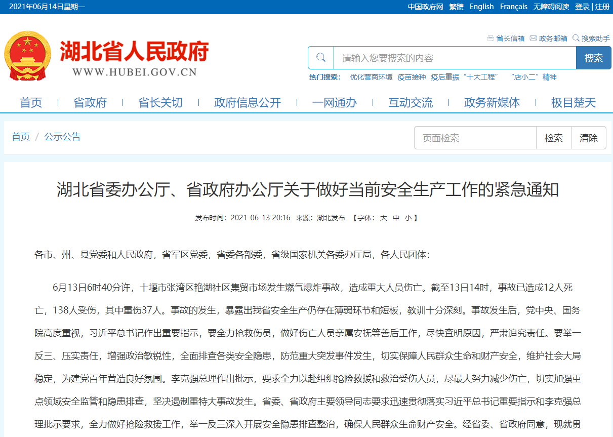 6月13日6时40分许,十堰市张湾区艳湖社区集贸市场发生燃气爆炸事故,造成重大人员伤亡。截至13日14时,事故已造成12人死亡,138人受伤,其中重伤37人。事故的发生,暴露出我省安全生产仍存在薄弱环节和短板,教训十分深刻。事故发生后,党中央、国务院高度重视,习近平总书记作出重要指示,要全力抢救伤员,做好伤亡人员亲属安抚等善后工作,尽快查明原因,严肃追究责任。要举一反三、压实责任,增强政治敏锐性,全面排查各类安全隐患,防范重大突发事件发生,切实保障人民群众生命和财产安全,维护社会大局稳定,为建党百年营造良好氛围。李克强总理作出批示,要求全力以赴组织抢险救援和救治受伤人员,尽最大努力减少伤亡,切实加强重点领域安全监管和隐患排查,坚决遏制重特大事故发生。省委、省政府主要领导同志要求迅速贯彻落实习近平总书记重要指示和李克强总理批示要求,全力做好抢险救援工作,举一反三深入开展安全隐患排查整治,确保人民群众生命财产安全。经省委、省政府同意,现就贯彻落实习近平总书记重要指示和李克强总理要求,深刻汲取事故教训、切实加强安全生产工作紧急通知如下。