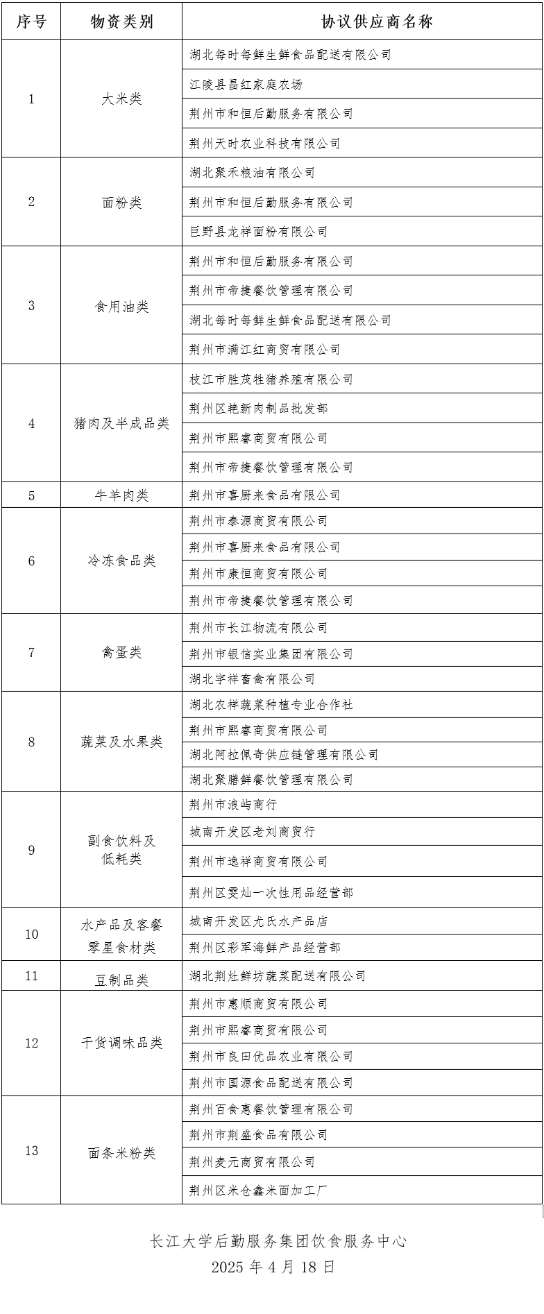 经评议组成员集中评议,以下34家协议供应商报价材料规范、品种齐全,符合饮食服务中心规定的供货条件,确定为饮食服务中心2025年5月份指定供货商。现公告如下: