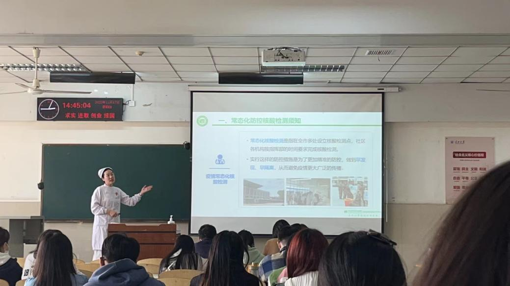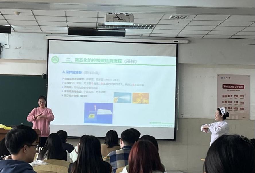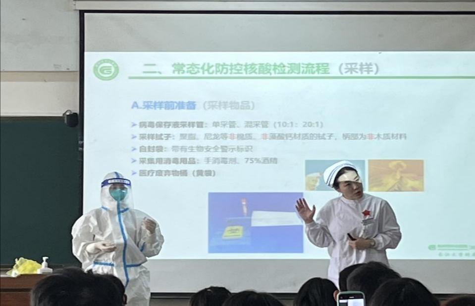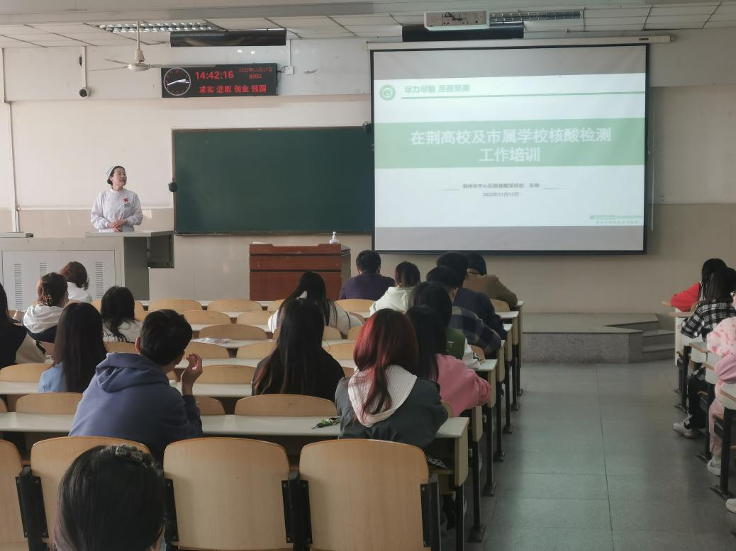 培训会上,荆州市中心医院朱艳护士长结合当前疫情防控政策要求,对扫码核验、核酸采样、标本转运、医疗废物的收集等方面进行了重点知识讲解。并现场演示工作帽、防护口罩、防护面屏、防护服、鞋套、手套等医疗用具的正确穿脱步骤及具体操作要领,邀请学生代表上台学习体验穿脱防护服,指导志愿者一起学习七步洗手法。