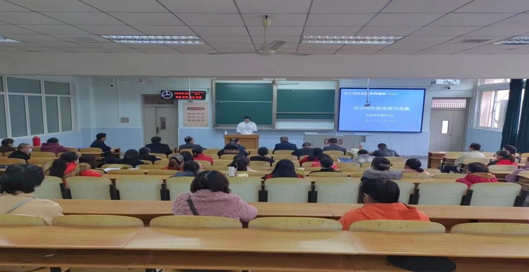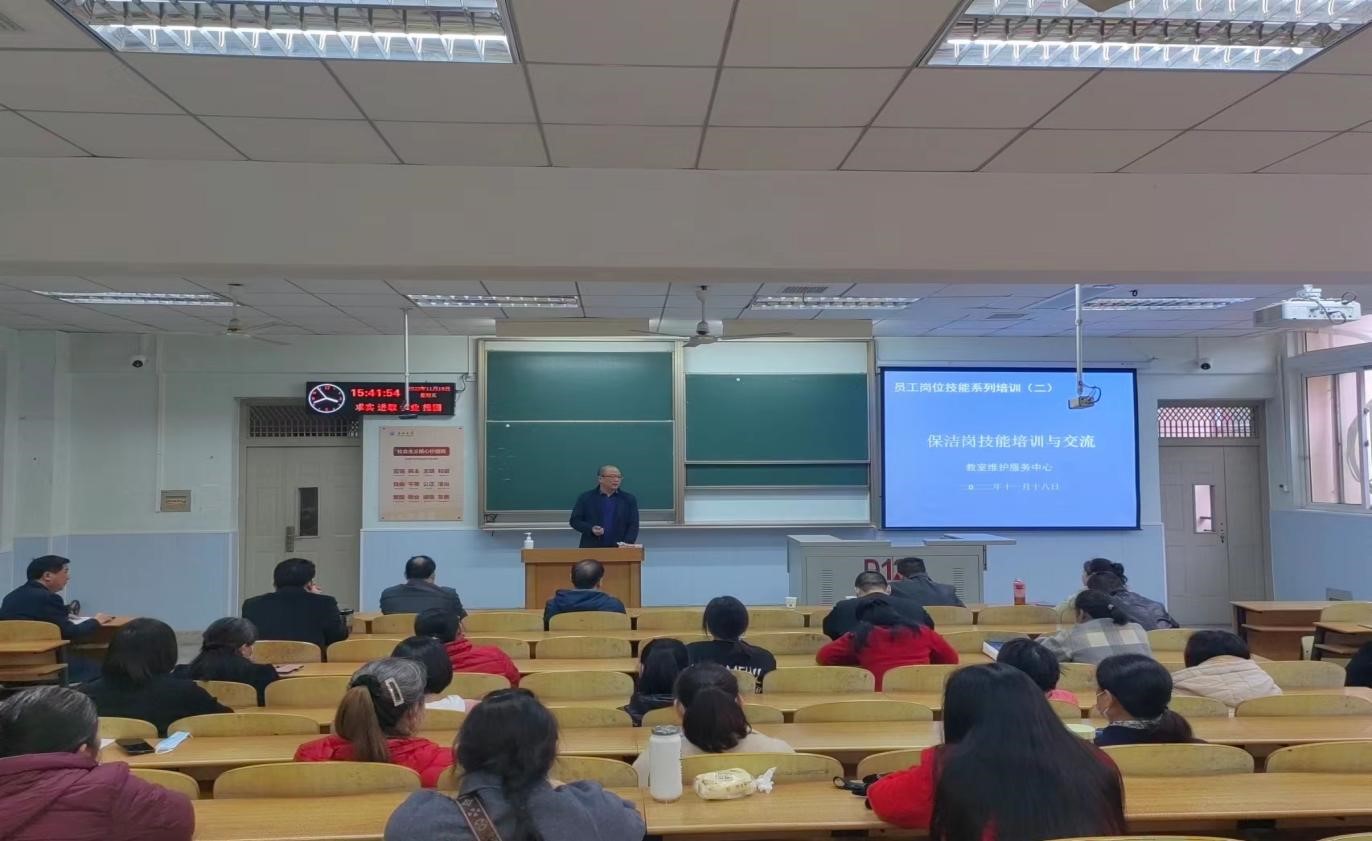 11月18日下午,教室维护服务中心在东校区13教D-125召开保洁岗技能培训交流会,伟德体育人力资源部、党政办公室、物业服务中心负责人、教室维护服务中心管理人员及保洁员代表70余人参加会议。伟德体育分管教室、物业的领导朱再春副部长受邀出席培训会。会议由教室维护服务中心副主任郑世涛主持。