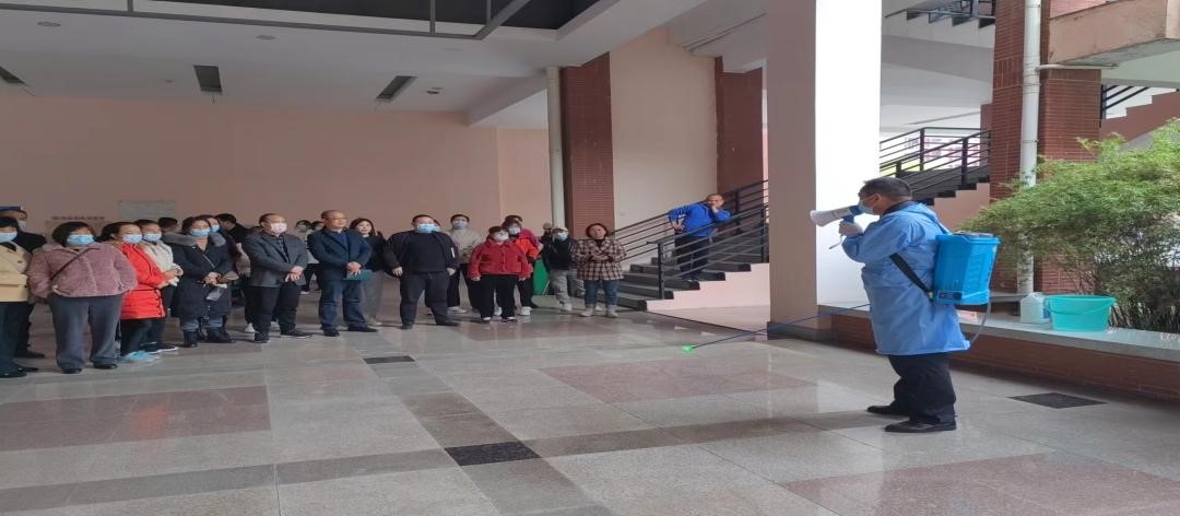 实际操作阶段,物业服务中心代表周宜洪示范了用84消毒液进行公共区域消杀的技巧及注意事项;教室维护服务中心代表喻娟梅现场传授了大排拖的使用方法和技巧。
