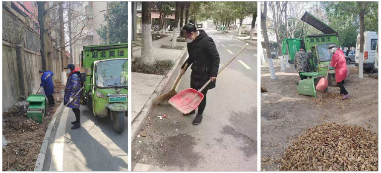 环卫工人全体春节期间无休,春节期间共清扫落叶 6 垃圾车,每天清运垃圾 130 余桶、果皮箱 83 个。