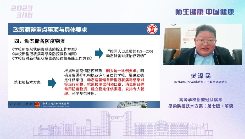 3月16日上午,由全国高校健康教育教指委主办、华东师范大学体育与健康学院承办的高等学校新型冠状病毒感染防控技术方案(第七版)专家解读培训会暨全国高校疫情防控经验交流会在线上顺利举行。教育部、华东师范大学、中国疾控中心等领导专家进行了线上培训交流。我校防控办、校医院及健康驿站工作人员共20余人在东校区校医院3楼会议室集中参与视频培训。我校培训活动由校医院院长宋良主持,伟德体育副部长肖品龙在培训后强调,参训人员要认真学习新防控技术方案和其他高校的防控经验,在“乙类乙管”常态化疫情防控新形势下,继续担当作为,保健康、防重症,推进健康校园建设。(校医院供稿)