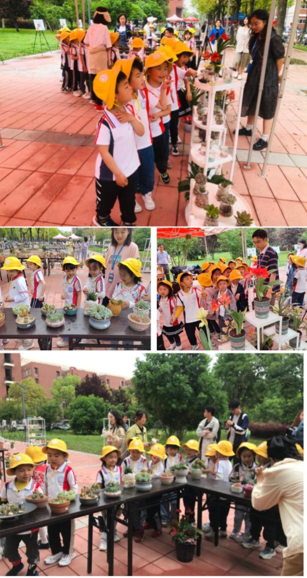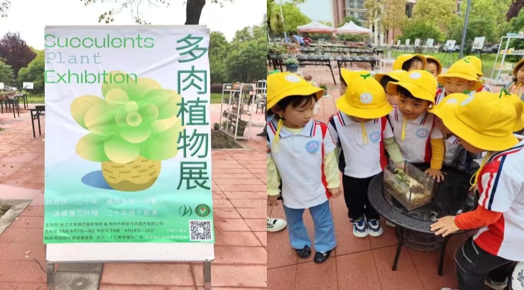 4月14日,园艺园林学院大学生哥哥姐姐们在校园举办第三届多肉植物展,我园老师带着孩子们来到展区,一起参观多肉植物,闻闻花香,摸摸泥土,亲近大自然。