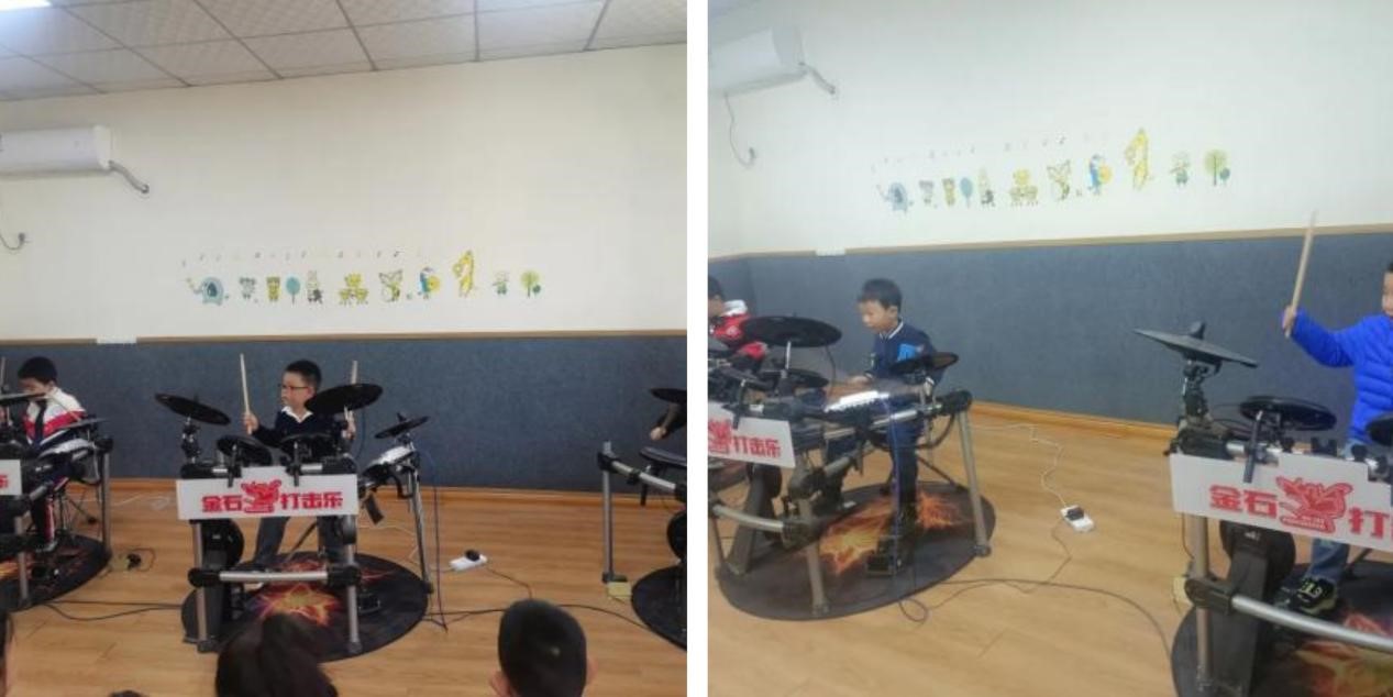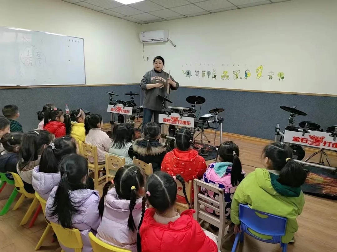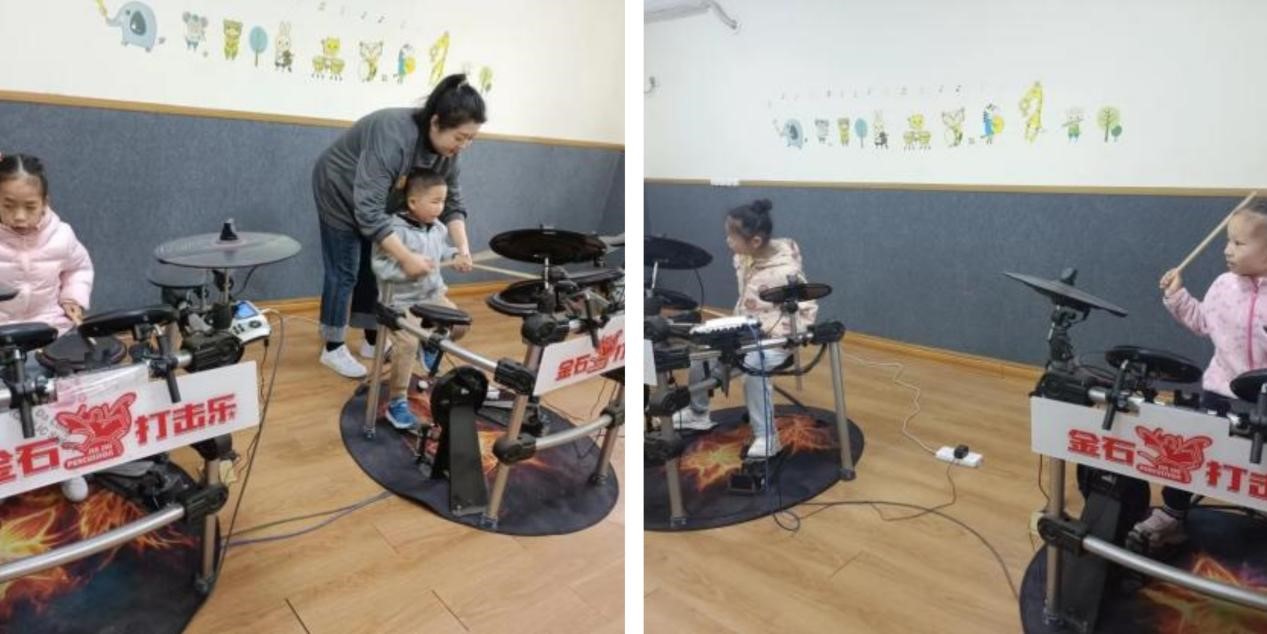 架子鼓属于节奏型乐器,学习架子鼓可以培养幼儿良好的节奏感,增强幼儿的协调能力。课堂上,老师给幼儿耐心讲解握鼓棒的距离和姿势,鼓励幼儿大胆表现自己,通过练习,幼儿不仅学习了架子鼓的基本知识,还能够灵活运用自己的手腕。