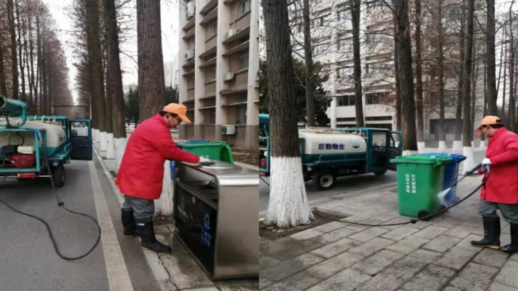 根据会议内容,校园环卫在做好日常保洁的基础上,对校园进行彻底的大扫除,对部分路面进行冲洗,加大了保洁清扫力度。并且按照疫情防控要求,为了做好公共区域的消杀防控工作,对公共区域的垃圾桶、果皮箱进行一次彻底的清洗消杀。