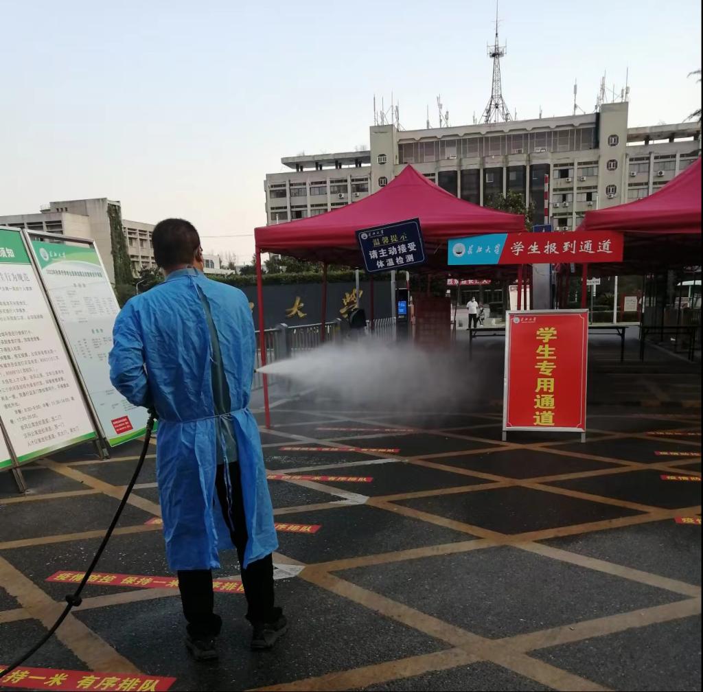 9月2日上午,一年一度的学校迎新工作正式启动。受全国疫情反弹趋势的影响,今年的迎新工作少了一点锣鼓喧天,多了一丝严谨慎重。我物业服务中心的一线工作人员勇往直前,再挑迎新重担。环卫工人们交织忙碌在学校的各个角落,辛勤付出,对核酸检测点和迎新通道进行了重点消杀,消杀次数已然达到了每2小时一次!只为了这些来自五湖四海的莘莘学子、为这些追逐梦想的年轻人披荆斩棘、保驾护航!