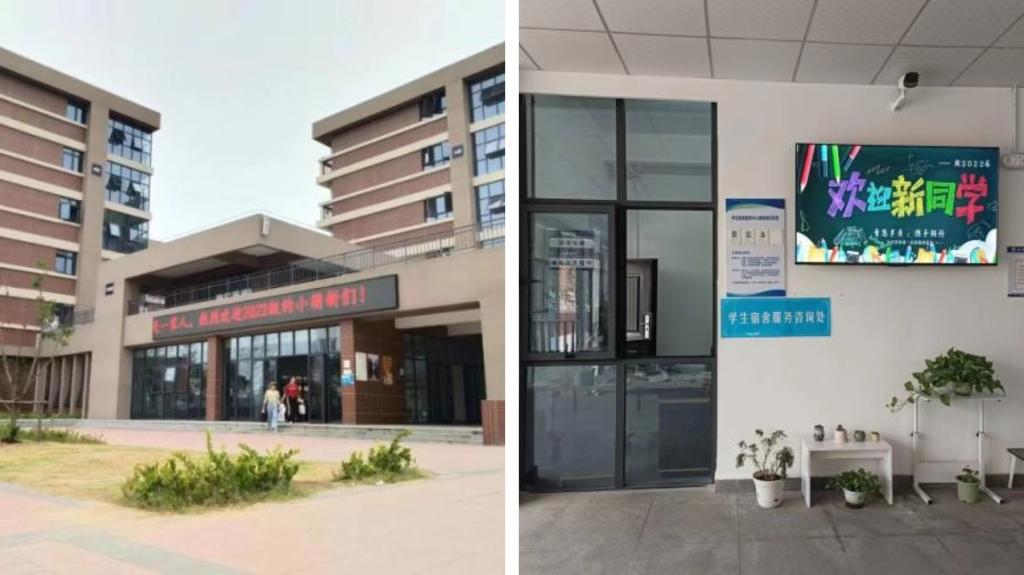 93日,迎来了2022级新生入学报到。宿舍楼前早已挂上了对新生美好祝愿的横幅,显示屏播放着“开学啦”等迎新视频。