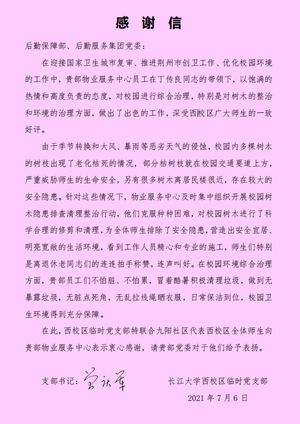 7月6日,伟德体育党委收到西校区临时党支部联合九阳社区发来的《感谢信》,对物业服务中心在西校区校园综合治理、环境治理等方面开展的工作给予高度赞扬。