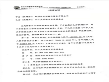 9月15日,荆州市众源餐饮服务有限公司与我校教育发展基金会签订捐赠协议。据悉,该公司无偿捐赠15万元爱心款,用于资助我校家庭经济困难的学生作假期返家路费,以实际行动照亮寒门学子的回家路。